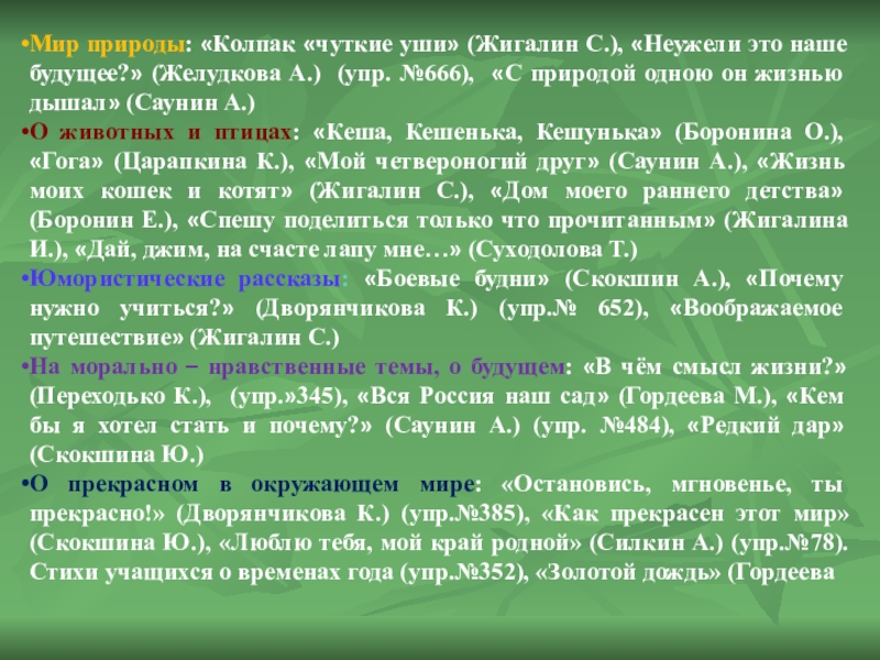 О прекрасном в окружающем мире: «Остановись, мгновенье, ты прекрасно!» (Дворянчикова К.) (упр.№385), «Как прекрасен этот мир» (Скокшина Ю.), «Люблю тебя, мой край родной» (Силкин А.) (упр.№78). Стихи учащихся о временах года (упр.№352), «Золотой дождь» (Гордеева
