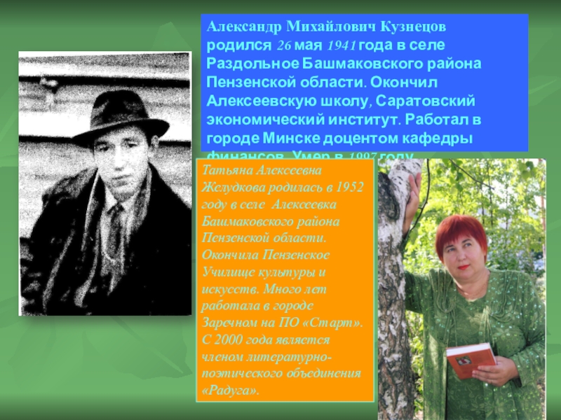 Татьяна Алексеевна Желудкова родилась в 1952 году в селе Алексеевка Башмаковского района Пензенской области. Окончила Пензенское Училище культуры и искусств. Много лет работала в городе Заречном на ПО «Старт». С 2000 года является членом литературно-поэтического объединения «Радуга».