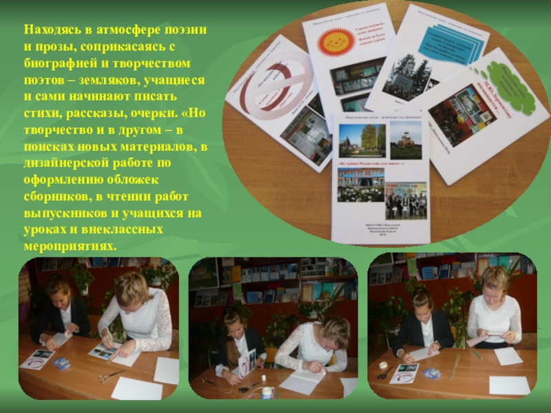 поэтов – земляков, учащиеся и сами начинают писать стихи, рассказы, очерки. «Но творчество и в другом – в поисках новых материалов, в дизайнерской работе по оформлению обложек сборников, в чтении работ выпускников и учащихся на уроках и внеклассных мероприятиях.