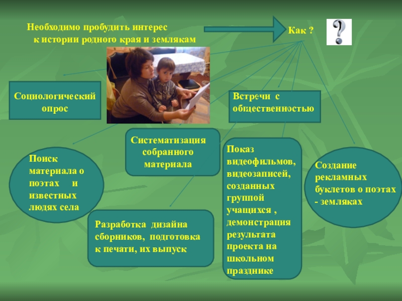 Демонстрация результата проекта на школьном празднике, включающем выразительное чтение стихов авторов- земляков, фрагментов творческих работ учащихся и выпускников нашей школы (пригласить на праздник тех ребят, которые когда – то посвящали свои работы краеведческой теме, устроив чтение и комментирование их на встречах с сегодняшними участниками проекта – обмен творческими предложениями)