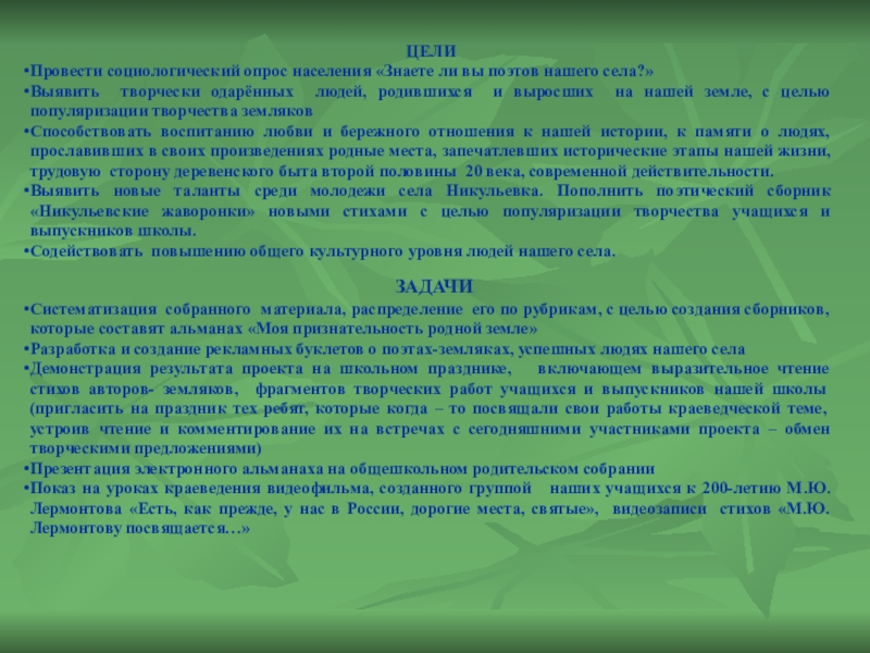 Выявить новые таланты среди молодежи села Никульевка. Пополнить поэтический сборник «Никульевские жаворонки» новыми стихами с целью популяризации творчества учащихся и выпускников школы.