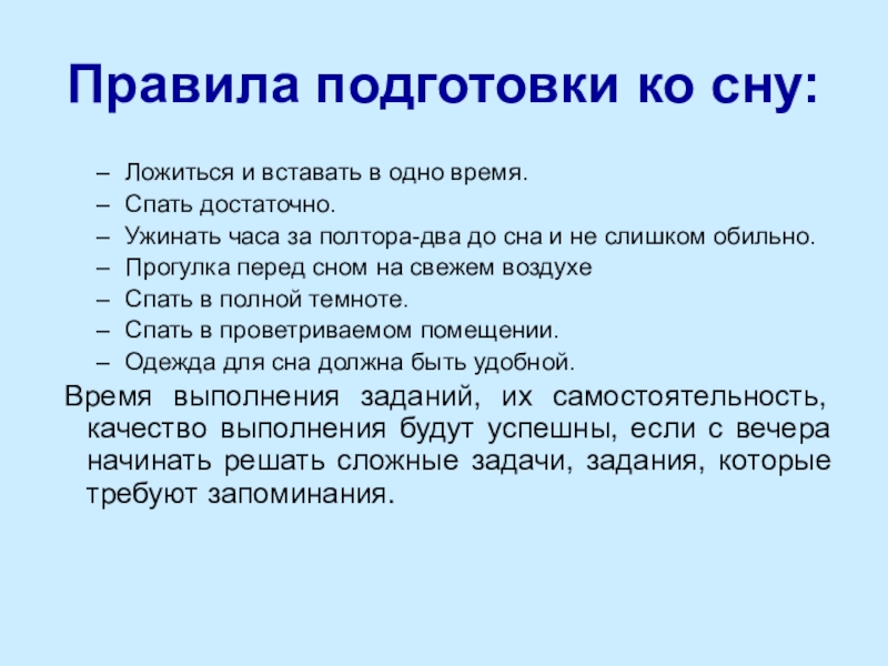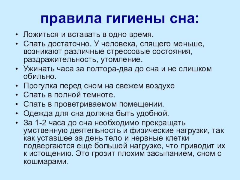 соблюдать правила подготовки ко сну, придерживаться режима дня, то снижается риск возникновения различных стрессовых состояний, утомление; повышается трудоспособность.