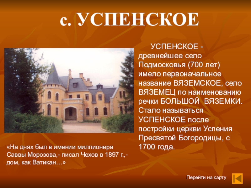 УСПЕНСКОЕ - древнейшее село Подмосковья (700 лет) имело первоначальное название ВЯЗЕМСКОЕ, село ВЯЗЕМЕЦ по наименованию речки БОЛЬШОЙ ВЯЗЕМКИ. Стало называться УСПЕНСКОЕ после постройки церкви Успения Пресвятой Богородицы, с 1700 года.