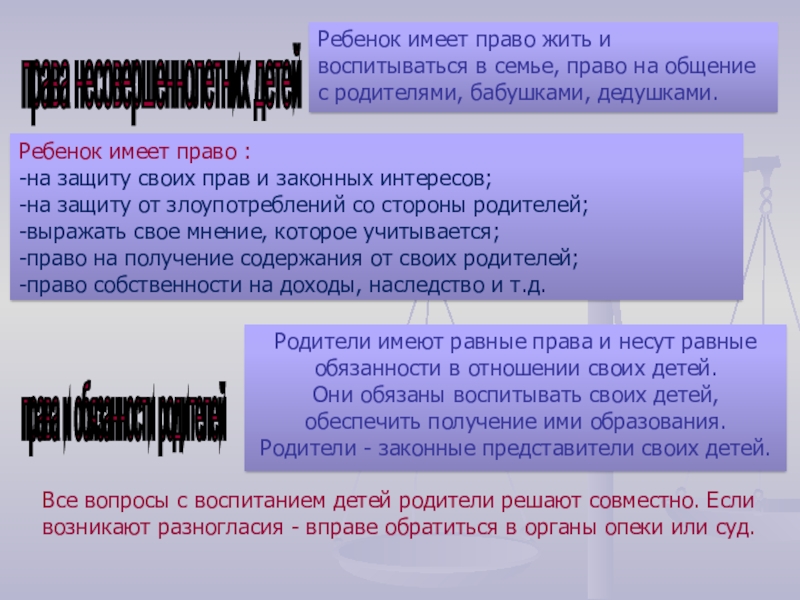 Родители имеют равные права и несут равные обязанности в отношении своих детей.