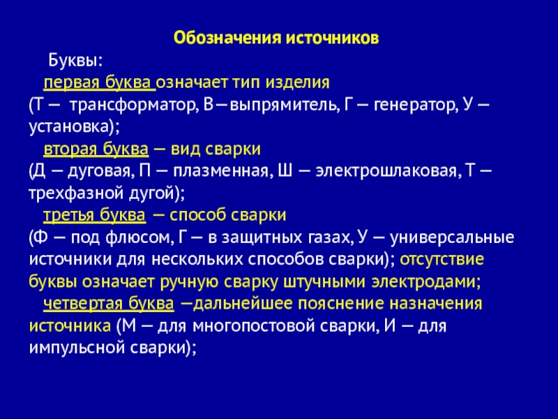 (Ф — под флюсом, Г — в защитных газах, У — универсальные источники для нескольких способов сварки); отсутствие буквы означает ручную сварку штучными электродами;