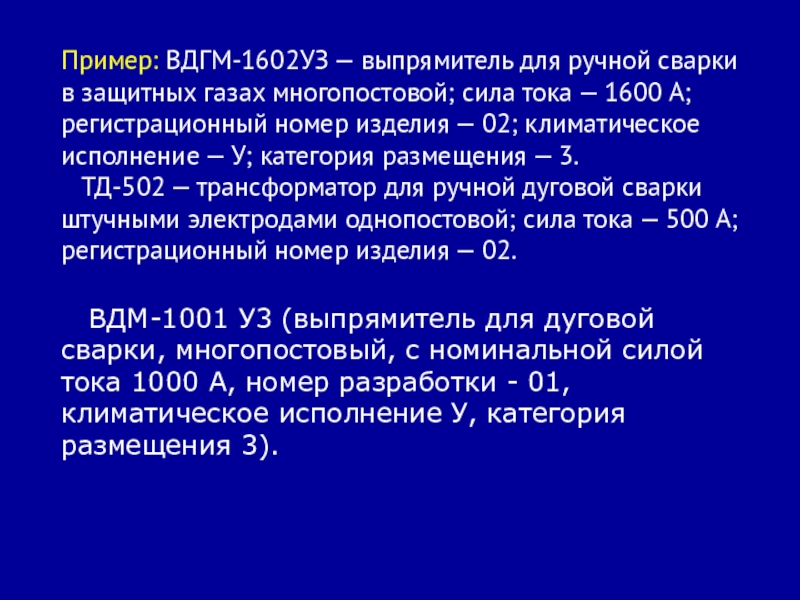 Пример: ВДГМ-1602УЗ — выпрямитель для ручной сварки в защитных газах многопостовой; сила тока — 1600 А; регистрационный номер изделия — 02; климатическое исполнение — У; категория размещения — 3.
