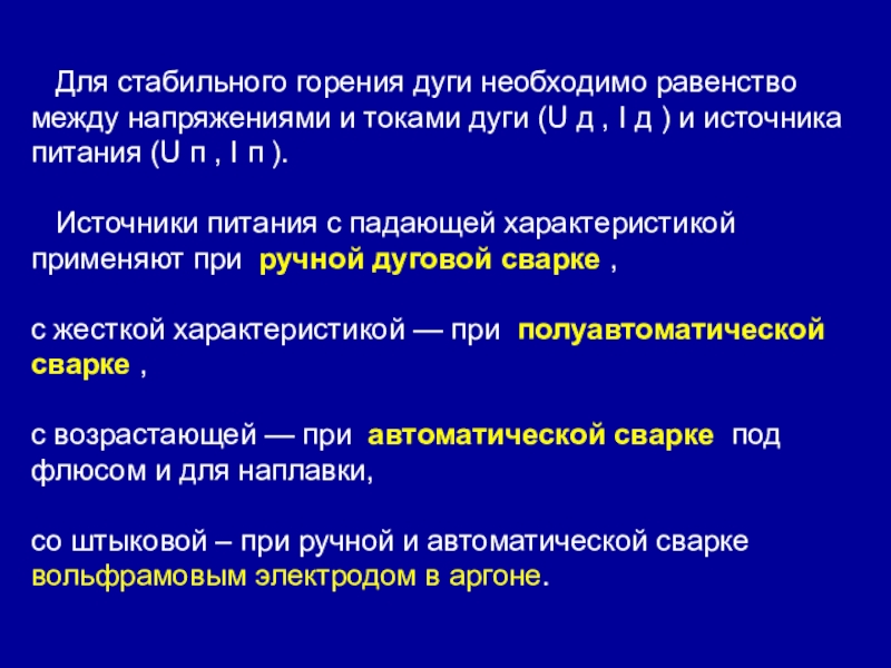 Слайд 12 Для стабильного горения дуги необходимо равенство между напряжениями и