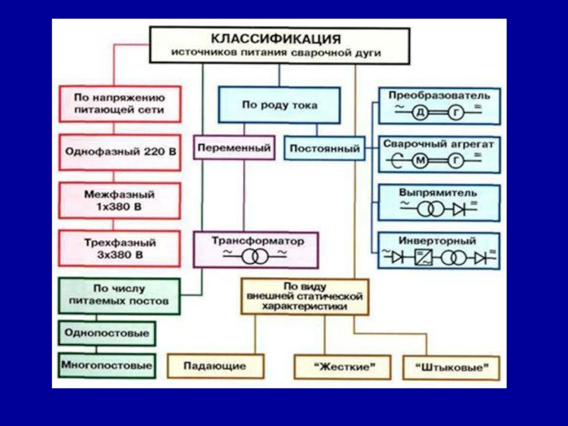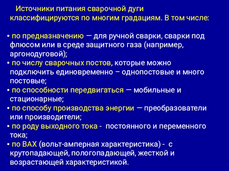 по ВАХ (вольт-амперная характеристика) - с крутопадающей, пологопадающей, жесткой и возрастающей характеристикой.
