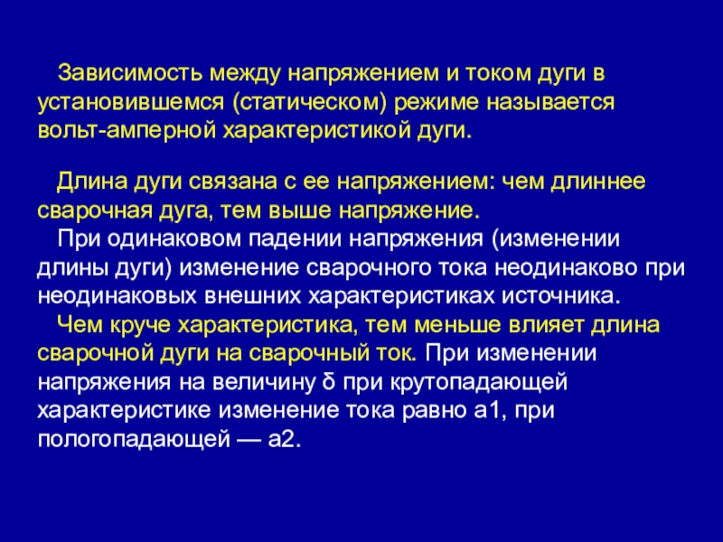 Чем круче характеристика, тем меньше влияет длина сварочной дуги на сварочный ток. При изменении напряжения на величину δ при крутопадающей характеристике изменение тока равно а1, при пологопадающей — а2.