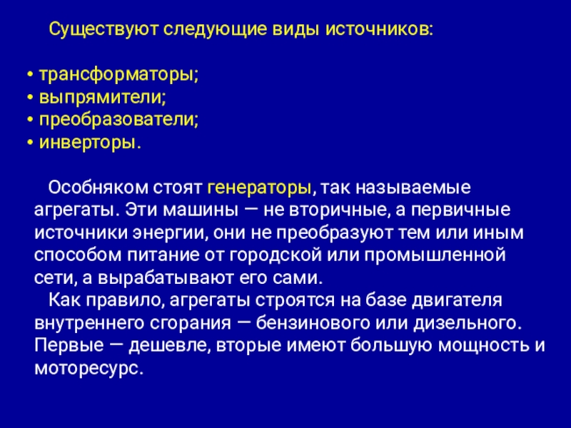 Особняком стоят генераторы, так называемые агрегаты. Эти машины — не вторичные, а первичные источники энергии, они не преобразуют тем или иным способом питание от городской или промышленной сети, а вырабатывают его сами.