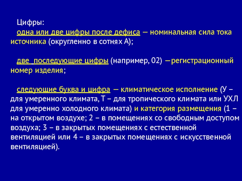 следующие буква и цифра — климатическое исполнение (У – для умеренного климата, Т – для тропического климата или УХЛ для умеренно холодного климата) и категория размещения (1 – на открытом воздухе; 2 – в помещениях со свободным доступом воздуха; 3 – в закрытых помещениях с естественной вентиляцией или 4 – в закрытых помещениях с искусственной вентиляцией).