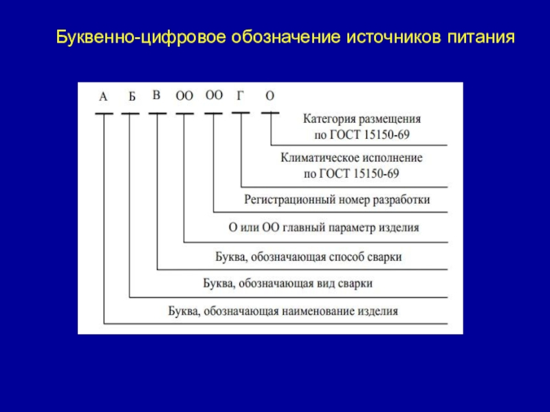 Слайд 15Буквенно-цифровое обозначение источников питания