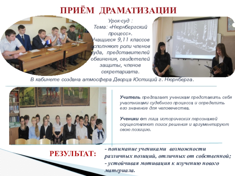 Учитель предлагает ученикам представить себя участниками судебного процесса и определить его значение для человечества.
