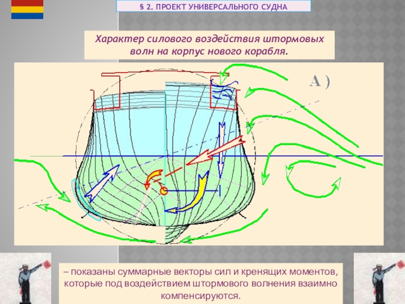 – показаны суммарные векторы сил и кренящих моментов, которые под воздействием штормового волнения взаимно компенсируются.