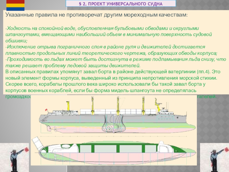 2. Существенное уменьшение площади, а также поперечного и продольного моментов инерции действующей ватерлинии и заострение ее в оконечностях для уменьшения силового воздействия умеренного волнения и сохранения ходкости в условиях океанского плавания;