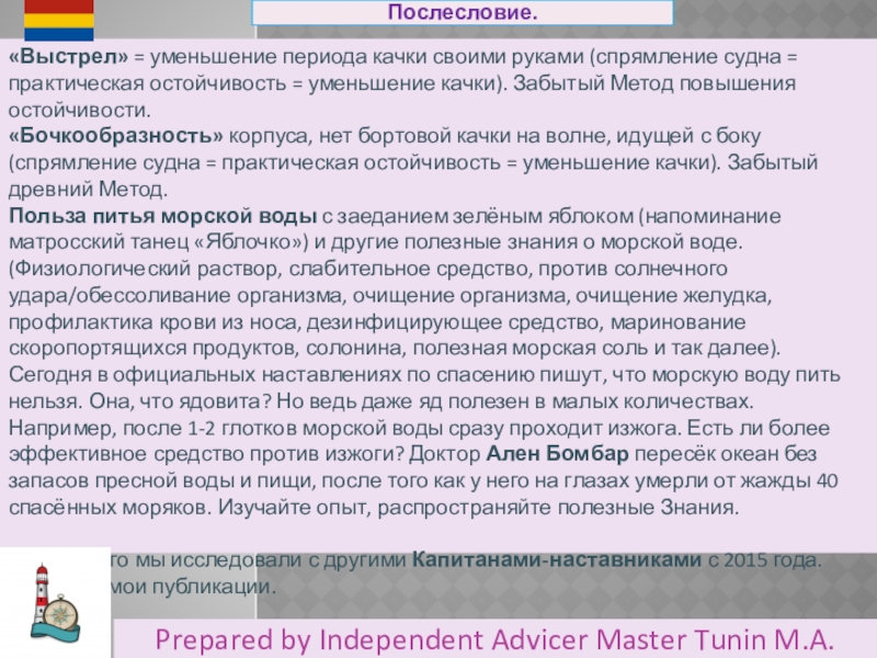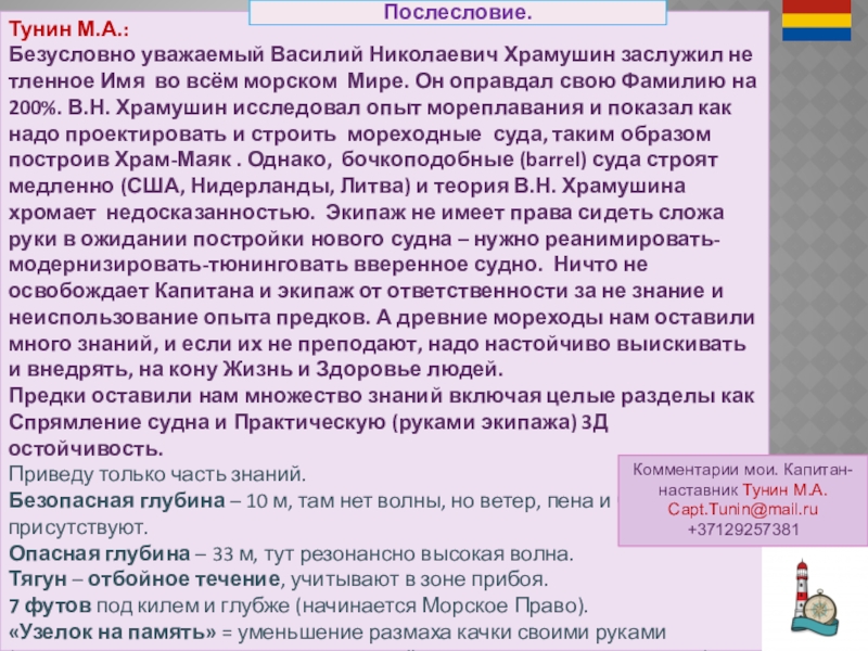 во всём морском Мире. Он оправдал свою Фамилию на 200%. В.Н. Храмушин исследовал опыт мореплавания и показал как надо проектировать и строить мореходные суда, таким образом построив Храм-Маяк . Однако, бочкоподобные (barrel) суда строят медленно (США, Нидерланды, Литва) и теория В.Н. Храмушина хромает недосказанностью. Экипаж не имеет права сидеть сложа руки в ожидании постройки нового судна – нужно реанимировать-модернизировать-тюнинговать вверенное судно. Ничто не освобождает Капитана и экипаж от ответственности за не знание и неиспользование опыта предков. А древние мореходы нам оставили много знаний, и если их не преподают, надо настойчиво выискивать и внедрять, на кону Жизнь и Здоровье людей.