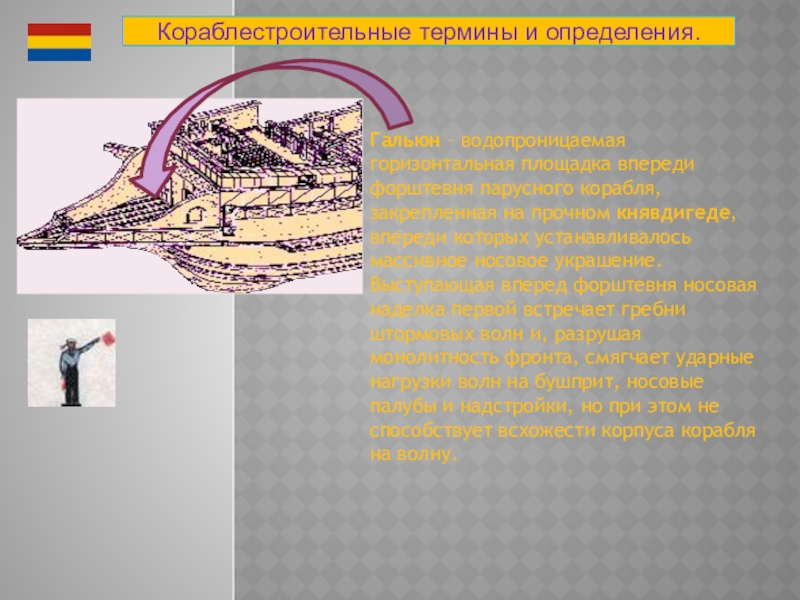 Слайд 5Гальюн – водопроницаемая горизонтальная площадка впереди форштевня парусного корабля, закрепленная на прочном княвдигеде,