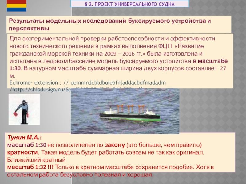 и эффективности нового технического решения в рамках выполнения ФЦП «Развитие гражданской морской техники на 2009 – 2016 гг.» была изготовлена и испытана в ледовом бассейне модель буксируемого устройства в масштабе 1:30. В натурном масштабе суммарная ширина двух корпусов составляет 27 м.