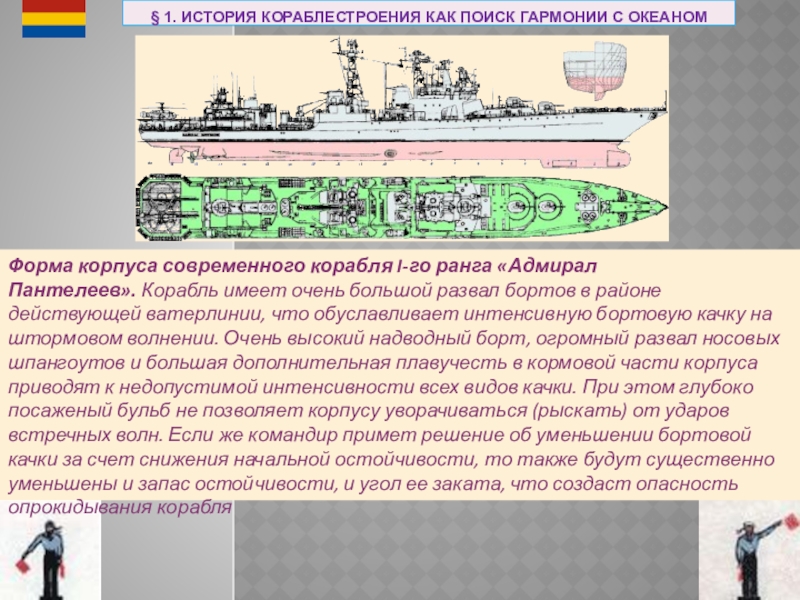 корабля I-го ранга «Адмирал Пантелеев». Корабль имеет очень большой развал бортов в районе действующей ватерлинии, что обуславливает интенсивную бортовую качку на штормовом волнении. Очень высокий надводный борт, огромный развал носовых шпангоутов и большая дополнительная плавучесть в кормовой части корпуса приводят к недопустимой интенсивности всех видов качки. При этом глубоко посаженый бульб не позволяет корпусу уворачиваться (рыскать) от ударов встречных волн. Если же командир примет решение об уменьшении бортовой качки за счет снижения начальной остойчивости, то также будут существенно уменьшены и запас остойчивости, и угол ее заката, что создаст опасность опрокидывания корабля