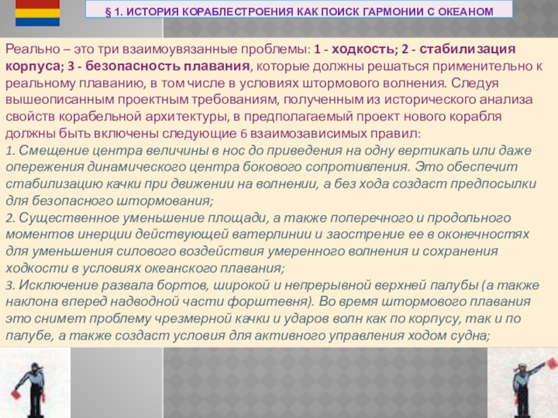 три взаимоувязанные проблемы: 1 - ходкость; 2 - стабилизация корпуса; 3 - безопасность плавания, которые должны решаться применительно к реальному плаванию, в том числе в условиях штормового волнения. Следуя вышеописанным проектным требованиям, полученным из исторического анализа свойств корабельной архитектуры, в предполагаемый проект нового корабля должны быть включены следующие 6 взаимозависимых правил: