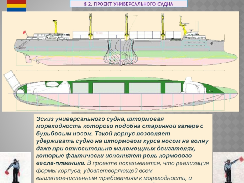 подобна старинной галере с бульбовым носом. Такой корпус позволяет удерживать судно на штормовом курсе носом на волну даже при относительно маломощных двигателях, которые фактически исполняют роль кормового весла-плавника. В проекте показывается, что реализация формы корпуса, удовлетворяющей всем вышеперечисленным требованиям к мореходности, и использование этого корпуса возможно даже в случае самого сложного универсального судна.