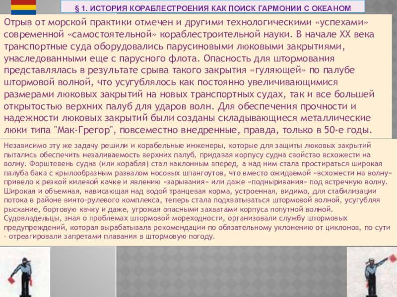 практики отмечен и другими технологическими «успехами» современной «самостоятельной» кораблестроительной науки. В начале XX века транспортные суда оборудовались парусиновыми люковыми закрытиями, унаследованными еще с парусного флота. Опасность для штормования представлялась в результате срыва такого закрытия «гуляющей» по палубе штормовой волной, что усугублялось как постоянно увеличивающимися размерами люковых закрытий на новых транспортных судах, так и все большей открытостью верхних палуб для ударов волн. Для обеспечения прочности и надежности люковых закрытий были созданы складывающиеся металлические люки типа "Мак-Грегор", повсеместно внедренные, правда, только в 50-е годы.