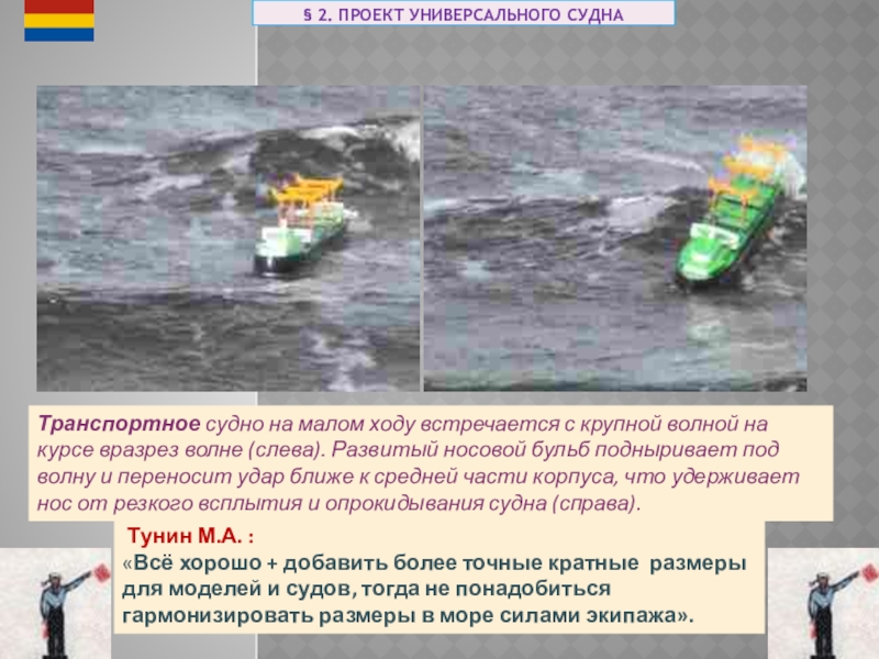 крупной волной на курсе вразрез волне (слева). Развитый носовой бульб подныривает под волну и переносит удар ближе к средней части корпуса, что удерживает нос от резкого всплытия и опрокидывания судна (справа).