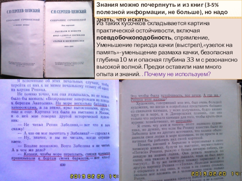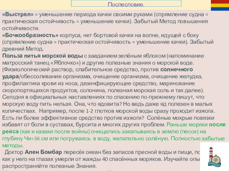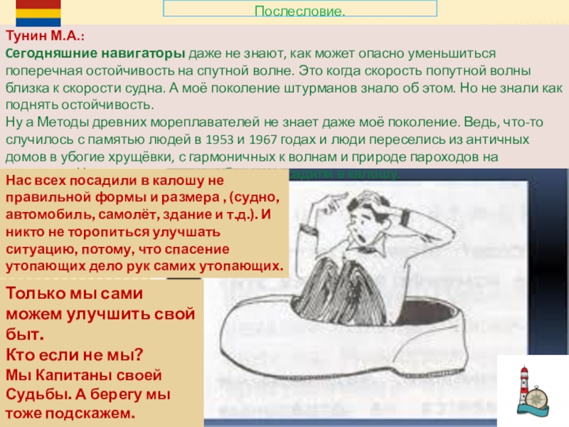 Ну а Методы древних мореплавателей не знает даже моё поколение. Ведь, что-то случилось с памятью людей в 1953 и 1967 годах и люди переселись из античных домов в убогие хрущёвки, с гармоничных к волнам и природе пароходов на самотопы. Нас всех на море и на берегу посадили в калошу.
