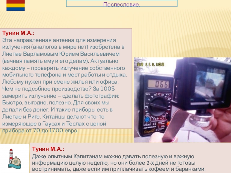 Эта направленная антенна для измерения излучения (аналогов в мире нет) изобретена в Лиепае Варламовым Юрием Васильевичем (вечная память ему и его делам). Актуально каждому – проверить излучение собственного мобильного телефона и мест работы и отдыха. Любому нужен при смене жилья или офиса. Чем не подсобное производство? За 100$ замерить излучение – сделать фотографии: Быстро, выгодно, полезно. Для своих мы делали без денег. И такие приборы есть в Лиепае и Риге. Китайцы делают что-то измеряющее в Гаусах и Теслах с ценой прибора от 70 до 1700 евро.