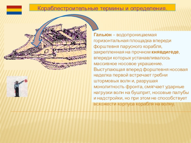 Слайд 5Гальюн – водопроницаемая горизонтальная площадка впереди форштевня парусного корабля, закрепленная на прочном княвдигеде,