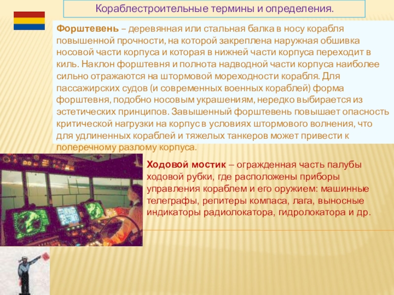 Слайд 13Ходовой мостик – огражденная часть палубы ходовой рубки, где расположены приборы управления