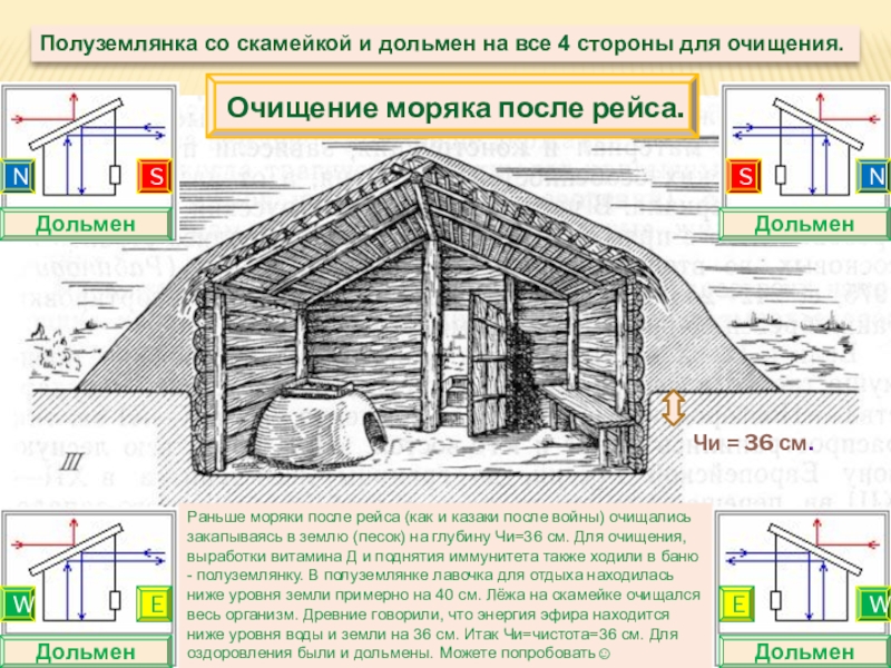 Раньше моряки после рейса (как и казаки после войны) очищались закапываясь в землю (песок) на глубину Чи=36 см. Для очищения, выработки витамина Д и поднятия иммунитета также ходили в баню - полуземлянку. В полуземлянке лавочка для отдыха находилась ниже уровня земли примерно на 40 см. Лёжа на скамейке очищался весь организм. Древние говорили, что энергия эфира находится ниже уровня воды и земли на 36 см. Итак Чи=чистота=36 см. Для оздоровления были и дольмены. Можете попробовать