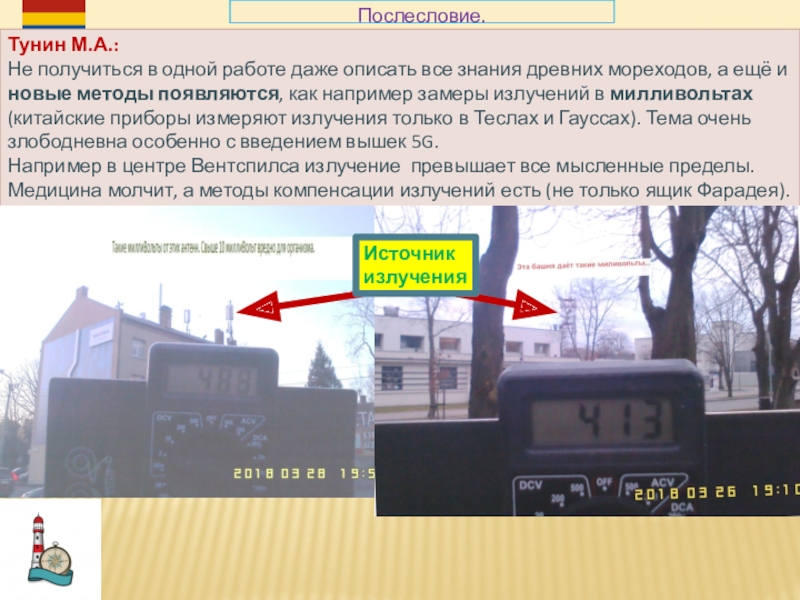 знания древних мореходов, а ещё и новые методы появляются, как например замеры излучений в милливольтах (китайские приборы измеряют излучения только в Теслах и Гауссах). Тема очень злободневна особенно с введением вышек 5G.