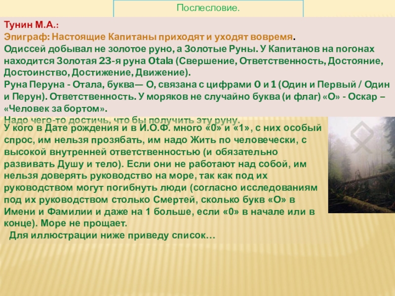 У кого в Дате рождения и в И.О.Ф. много «0» и «1», с них особый спрос, им нельзя прозябать, им надо Жить по человечески, с высокой внутренней ответственностью (и обязательно развивать Душу и тело). Если они не работают над собой, им нельзя доверять руководство на море, так как под их руководством могут погибнуть люди (согласно исследованиям под их руководством столько Смертей, сколько букв «О» в Имени и Фамилии и даже на 1 больше, если «0» в начале или в конце). Море не прощает.