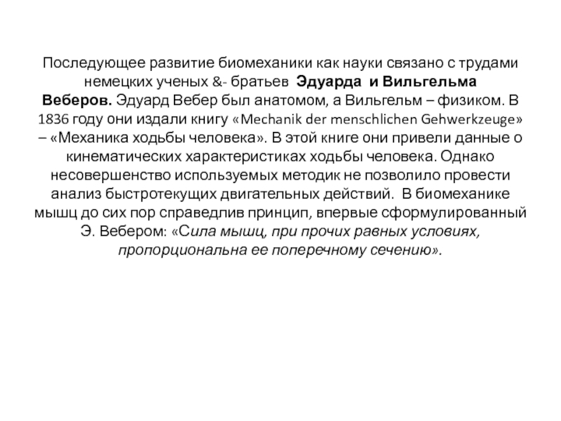 братьев Эдуарда и Вильгельма Веберов. Эдуард Вебер был анатомом, а Вильгельм – физиком. В 1836 году они издали книгу «Mechanik der menschlichen Gehwerkzeuge» – «Механика ходьбы человека». В этой книге они привели данные о кинематических характеристиках ходьбы человека. Однако несовершенство используемых методик не позволило провести анализ быстротекущих двигательных действий. В биомеханике мышц до сих пор справедлив принцип, впервые сформулированный Э. Вебером: «Сила мышц, при прочих равных условиях, пропорциональна ее поперечному сечению».