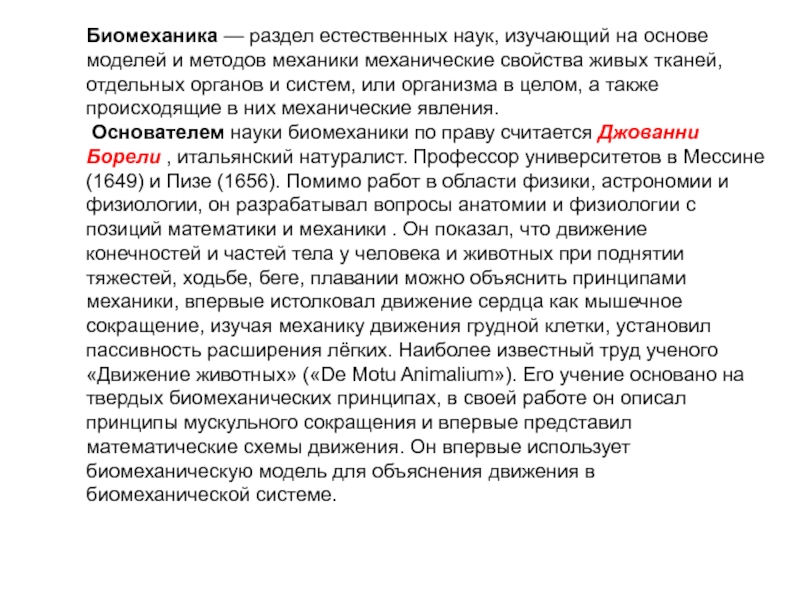 Основателем науки биомеханики по праву считается Джованни Борели , итальянский натуралист. Профессор университетов в Мессине (1649) и Пизе (1656). Помимо работ в области физики, астрономии и физиологии, он разрабатывал вопросы анатомии и физиологии с позиций математики и механики . Он показал, что движение конечностей и частей тела у человека и животных при поднятии тяжестей, ходьбе, беге, плавании можно объяснить принципами механики, впервые истолковал движение сердца как мышечное сокращение, изучая механику движения грудной клетки, установил пассивность расширения лёгких. Наиболее известный труд ученого «Движение животных» («Dе Motu Animalium»). Его учение основано на твердых биомеханических принципах, в своей работе он описал принципы мускульного сокращения и впервые представил математические схемы движения. Он впервые использует биомеханическую модель для объяснения движения в биомеханической системе.