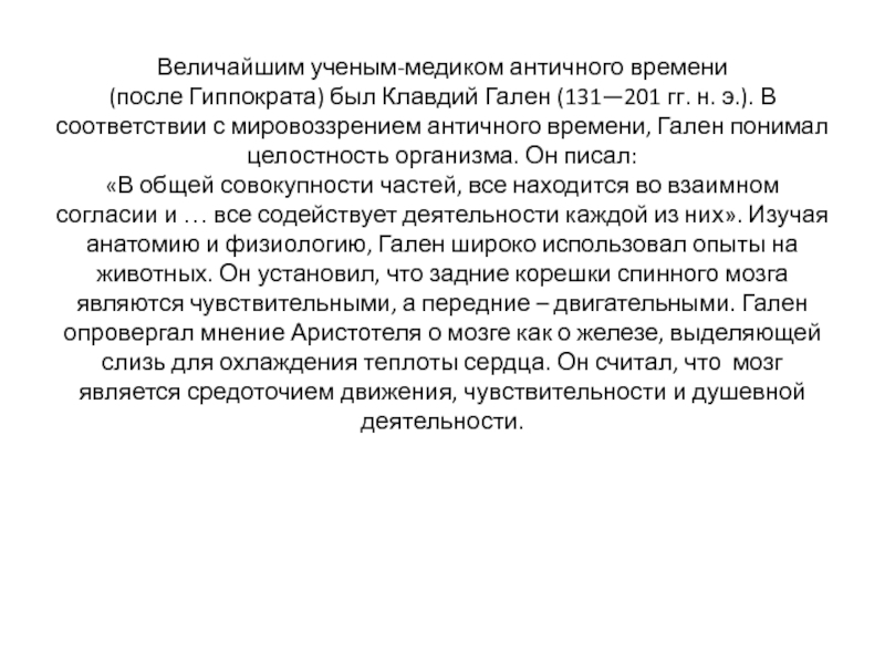 Слайд 4Величайшим ученым-медиком античного времени (после Гиппократа) был Клавдий Гален (131—201 гг. н. э.). В соответствии