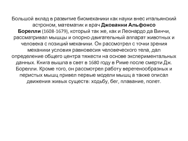 Слайд 7Большой вклад в развитие биомеханики как науки внес итальянский астроном, математик