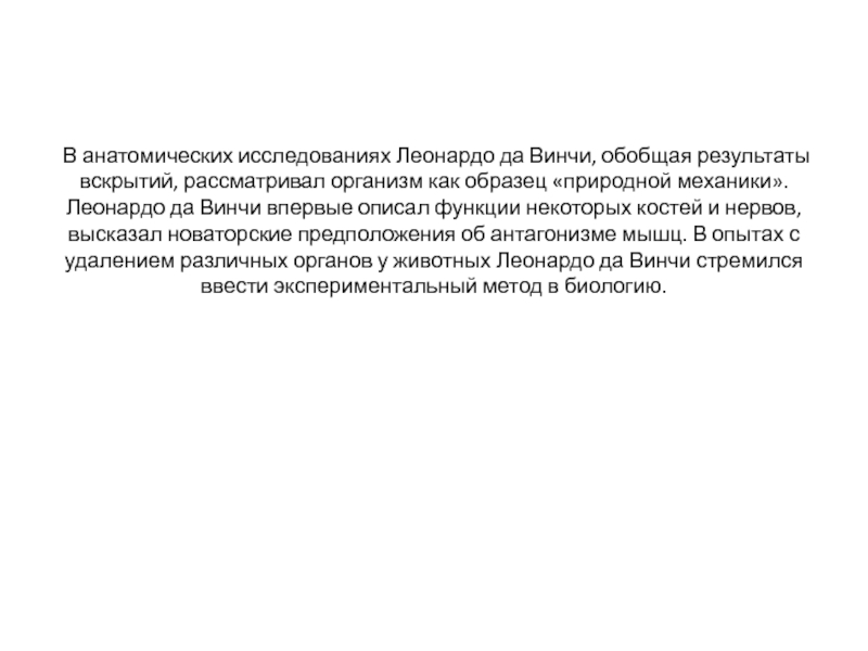 как образец «природной механики». Леонардо да Винчи впервые описал функции некоторых костей и нервов, высказал новаторские предположения об антагонизме мышц. В опытах с удалением различных органов у животных Леонардо да Винчи стремился ввести экспериментальный метод в биологию.