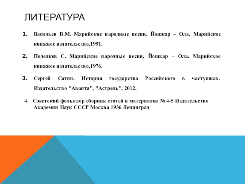 Васильев В.М. Марийские народные песни. Йошкар – Ола. Марийское книжное издательство,1991.