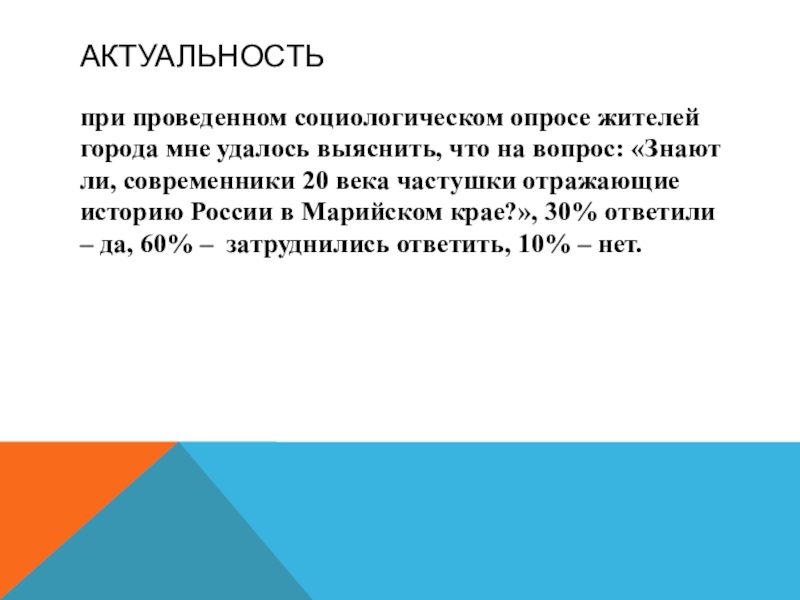 вопрос: «Знают ли, современники 20 века частушки отражающие историю России в Марийском крае?», 30% ответили – да, 60% – затруднились ответить, 10% – нет.