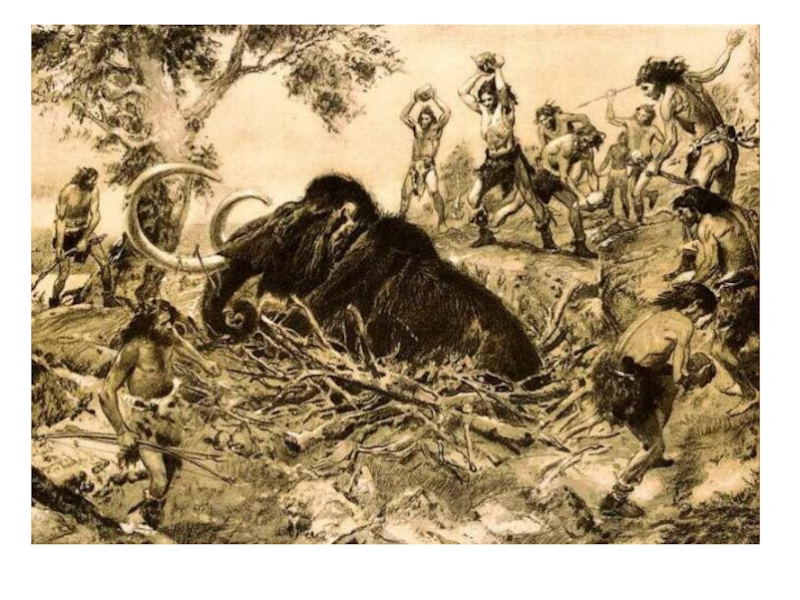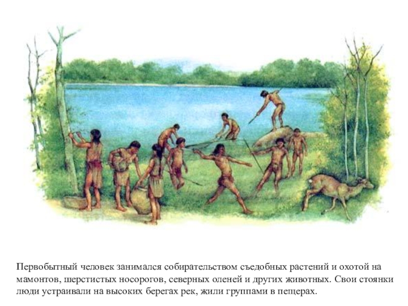 Слайд 3Первобытный человек занимался собирательством съедобных растений и охотой на мамонтов, шерстистых