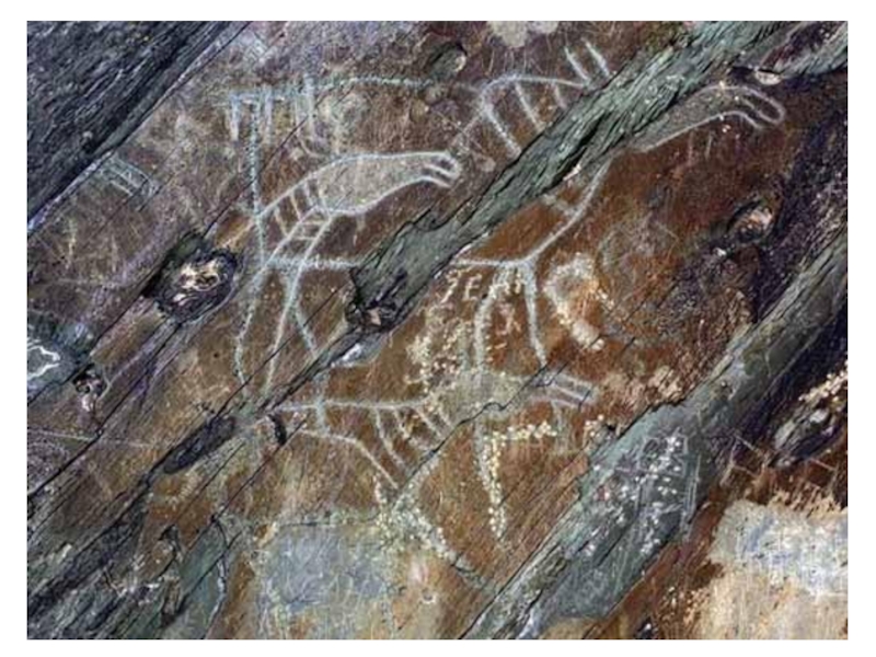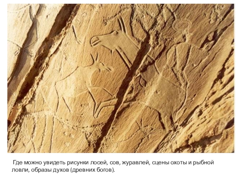 Слайд 7 Где можно увидеть рисунки лосей, сов, журавлей, сцены охоты и
