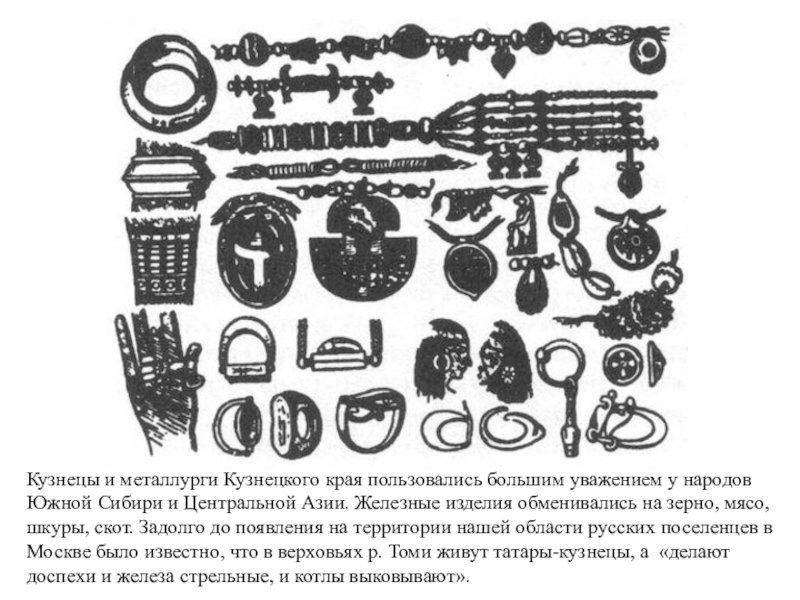 Сибири и Центральной Азии. Железные изделия обменивались на зерно, мясо, шкуры, скот. Задолго до появления на территории нашей области русских поселенцев в Москве было известно, что в верховьях р. Томи живут татары-кузнецы, а «делают доспехи и железа стрельные, и котлы выковывают».