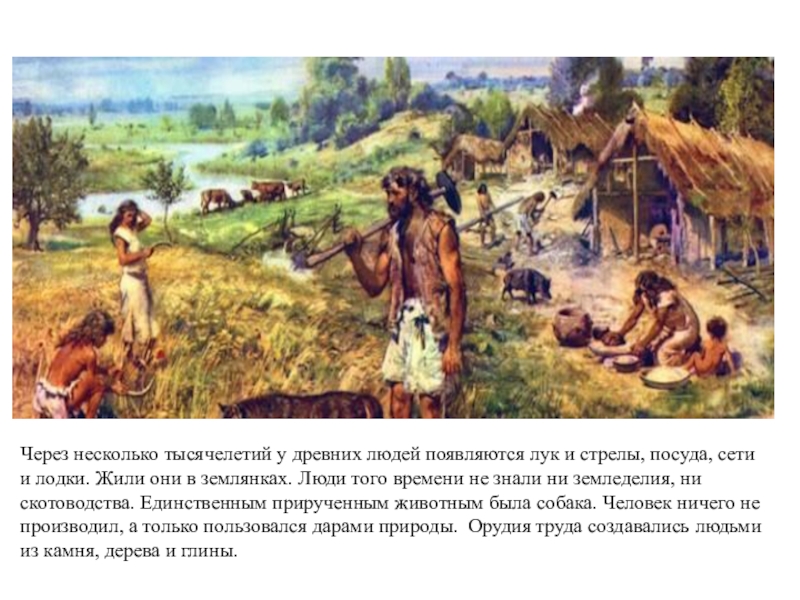 сети и лодки. Жили они в землянках. Люди того времени не знали ни земледелия, ни скотоводства. Единственным прирученным животным была собака. Человек ничего не производил, а только пользовался дарами природы. Орудия труда создавались людьми из камня, дерева и глины.