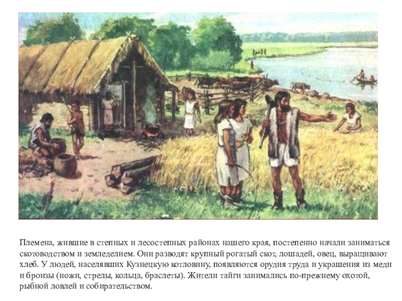 заниматься скотоводством и земледелием. Они разводят крупный рогатый скот, лошадей, овец, выращивают хлеб. У людей, населявших Кузнецкую котловину, появляются орудия труда и украшения из меди и бронзы (ножи, стрелы, кольца, браслеты). Жители тайги занимались по-прежнему охотой, рыбной ловлей и собирательством.