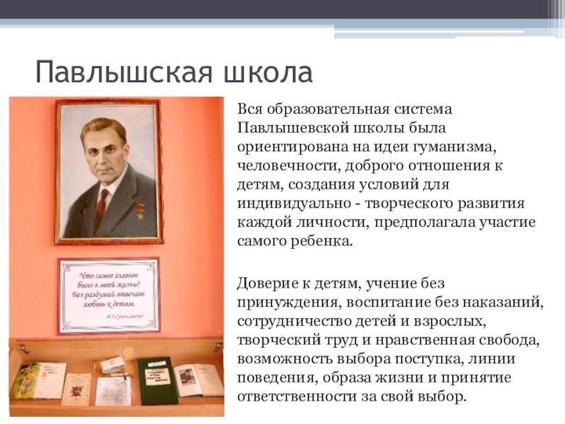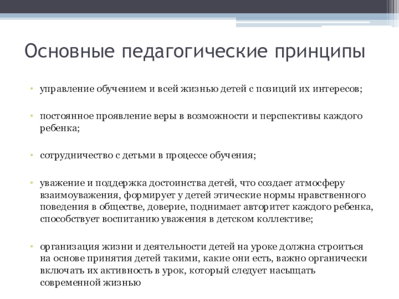 Основу его взглядов составляет вера в ребенка и любовь к нему. По его мнению, ребенок - это человек, который является величайшей из всех ценностей мира, и только тот может стать настоящим мастером - педагогом, кто верит в человека, в его безграничные возможности.
