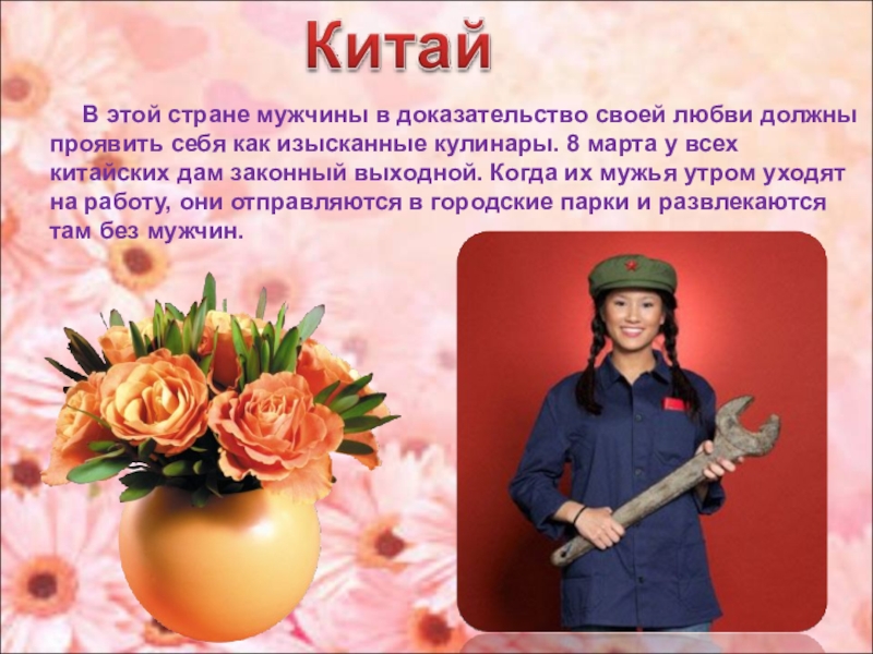 Слайд 15 Очень незаметно проходит для китайцев праздник 8 марта. Разве
