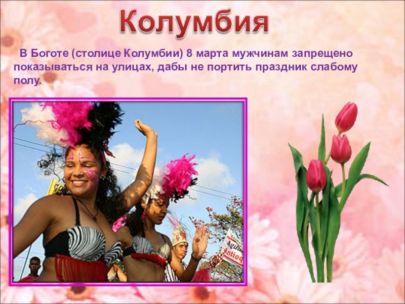 Слайд 20 В Боготе (столице Колумбии) 8 марта мужчинам запрещено показываться на