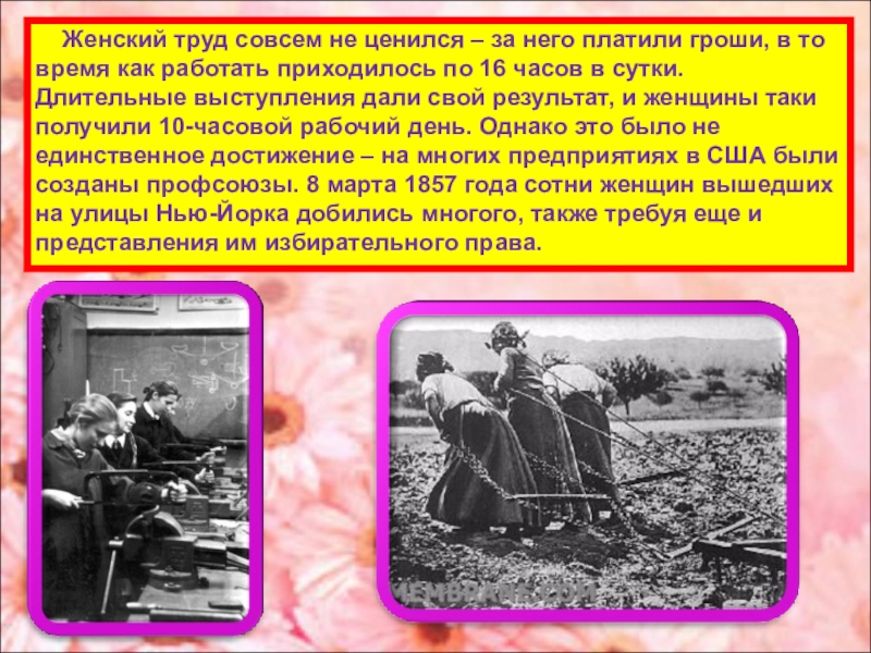 гроши, в то время как работать приходилось по 16 часов в сутки. Длительные выступления дали свой результат, и женщины таки получили 10-часовой рабочий день. Однако это было не единственное достижение – на многих предприятиях в США были созданы профсоюзы. 8 марта 1857 года сотни женщин вышедших на улицы Нью-Йорка добились многого, также требуя еще и представления им избирательного права.